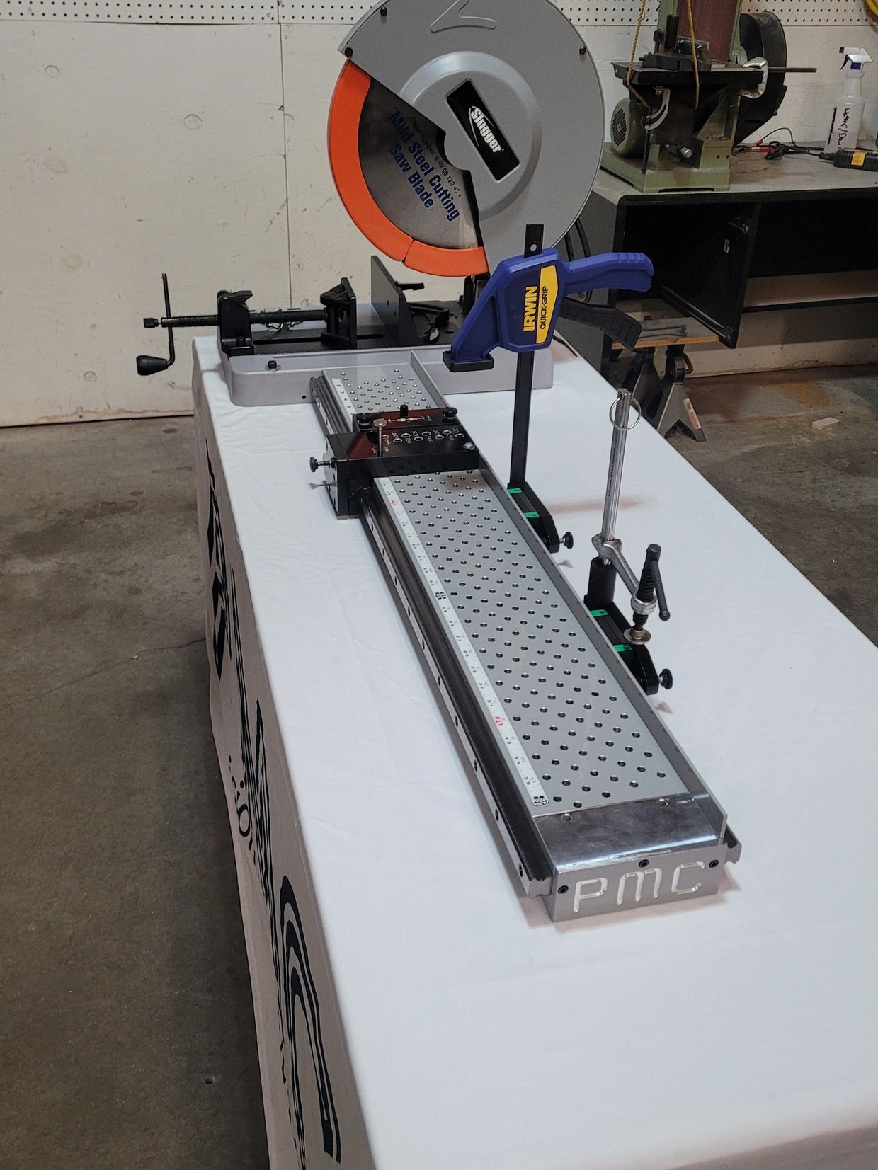 This quick adjusting material stop makes predetermined cuts a breeze, and without sacrificing accuracy. The 3600 model features pin locations every 1/8 inch up to 36 inches. After initial setup, repeatability and accuracy is + or - .010" over the full length of the setter. Up to 8ft. lengths are available. The Saw Setter comes with 2 types of material clamps attached to the opposite side rail to give you more clamping flexibility. The Saw Setter also comes with a micro-adjustment stop to fine tune those cuts between the 1/8-inch increments. Add or subtract a 32nd to all cuts at any time. The quick removable carriage allows for longer pieces of material to be cut. The 6061 aluminum channel is secure to the worktable on each end with an adjustable riser. The risers have a 1/2 inch height adjustment. Standard height range is from 2.0"-2.5". The SLS-3600 can be used with standard Slugger saws and also Evolution models S355CPSL, S14CPS, and R355CPS models. Comes with a 1 yr. limited warranty.